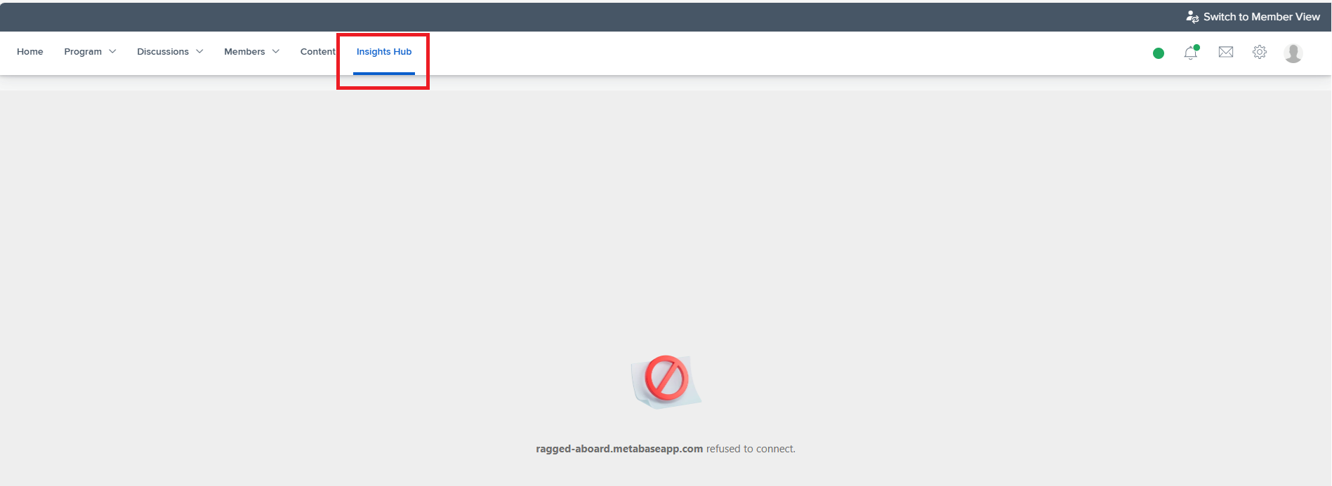 Error: ragged-aboard.metabaseapp.com refused to connect. Path: /corporate/metabase_dashboards when clicking Insights Hub. -